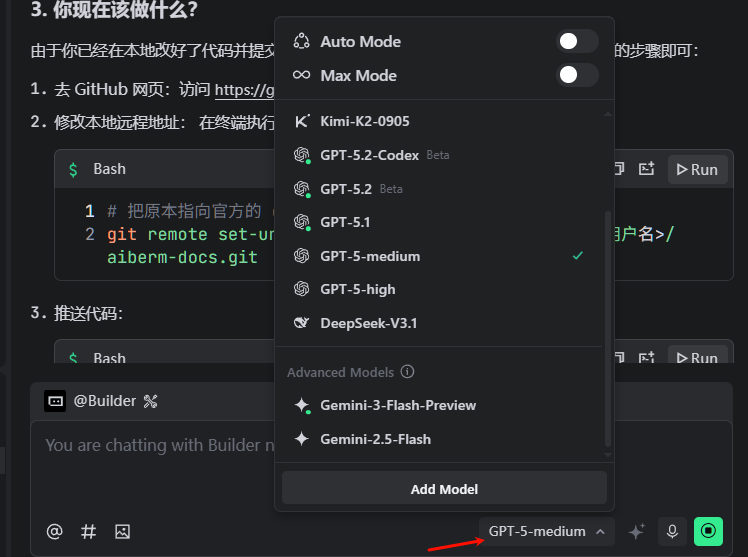 Ctrl/Cmd + Shift + P) and search for “Chat”. - Select Your Custom Model: In the chat panel, click the model dropdown at the bottom-right corner and select the Aiberm model you just added.
